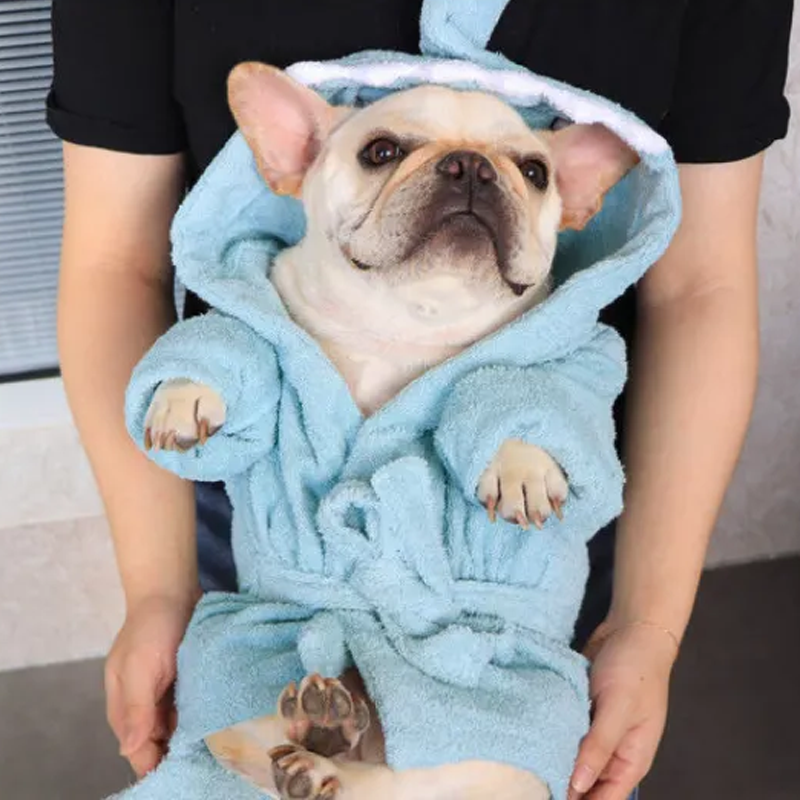 Amazing quality! The bathrobe dries my pup in no time and keeps her warm after bath time. I also love how easy it is to put on with the tie-up belt. Bonus points for making her look like a tiny, fierce shark!